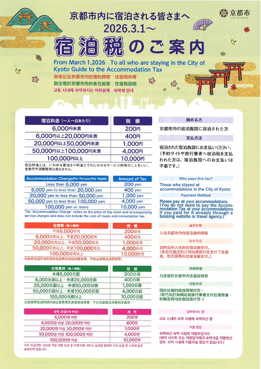 京都市宿泊税につきまして、2026年3月1日(日)ご宿泊分より税率が改定されます。